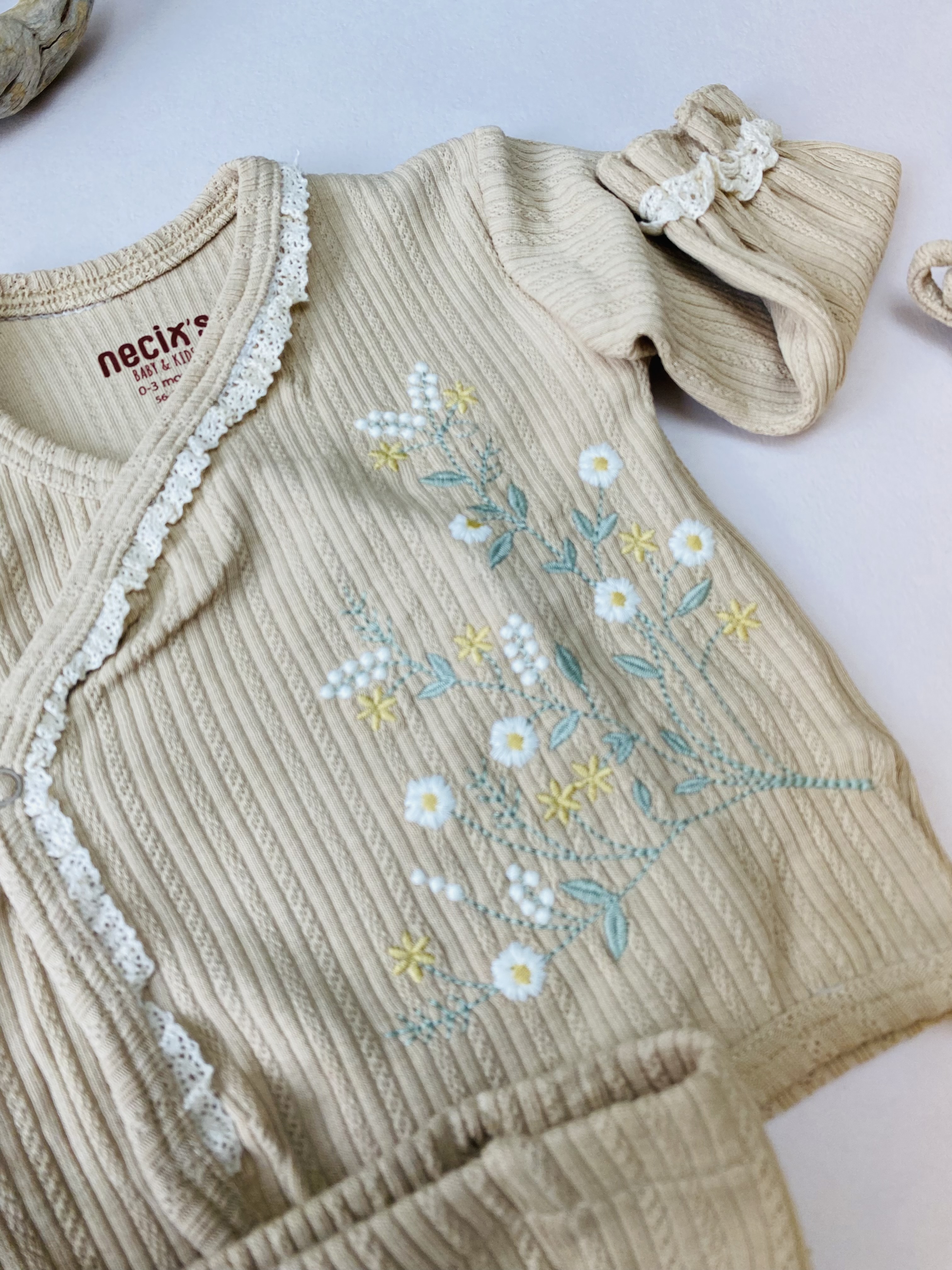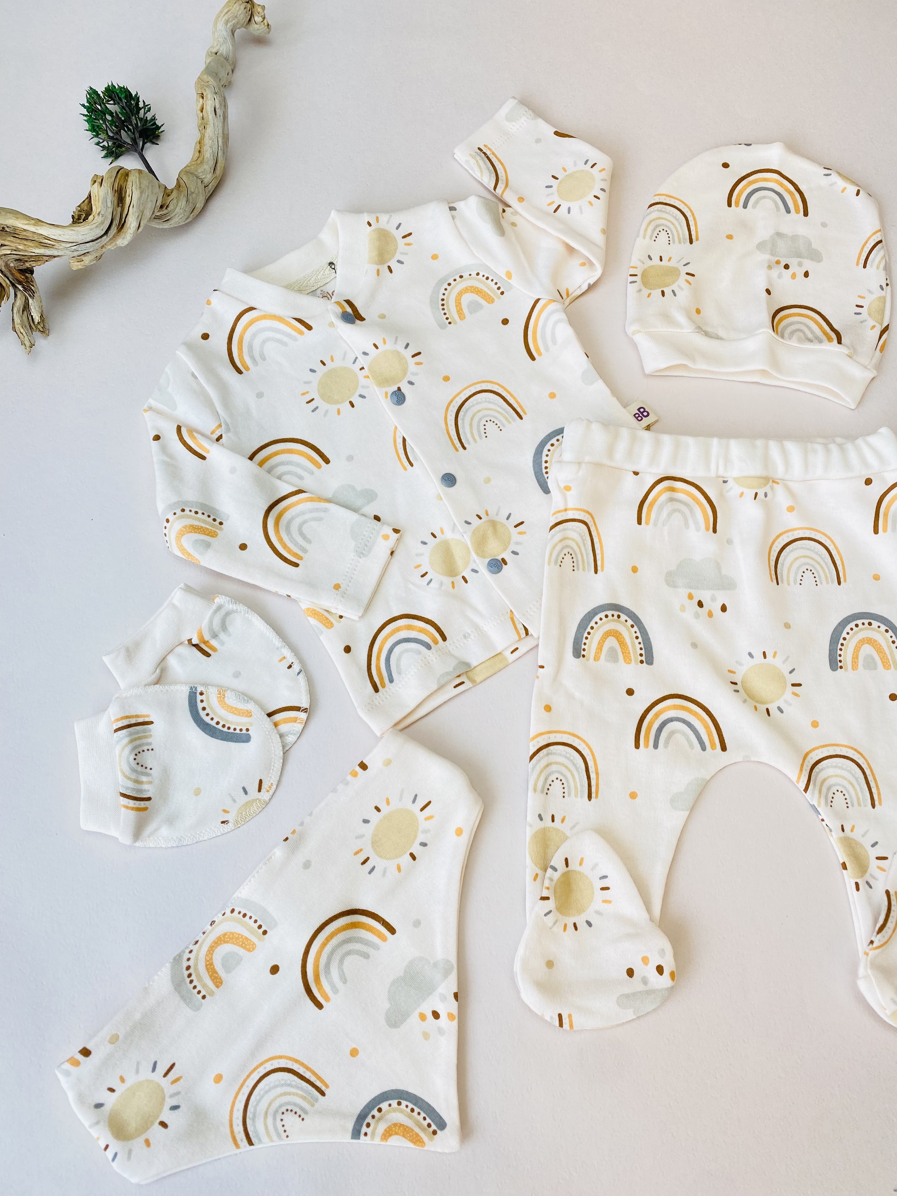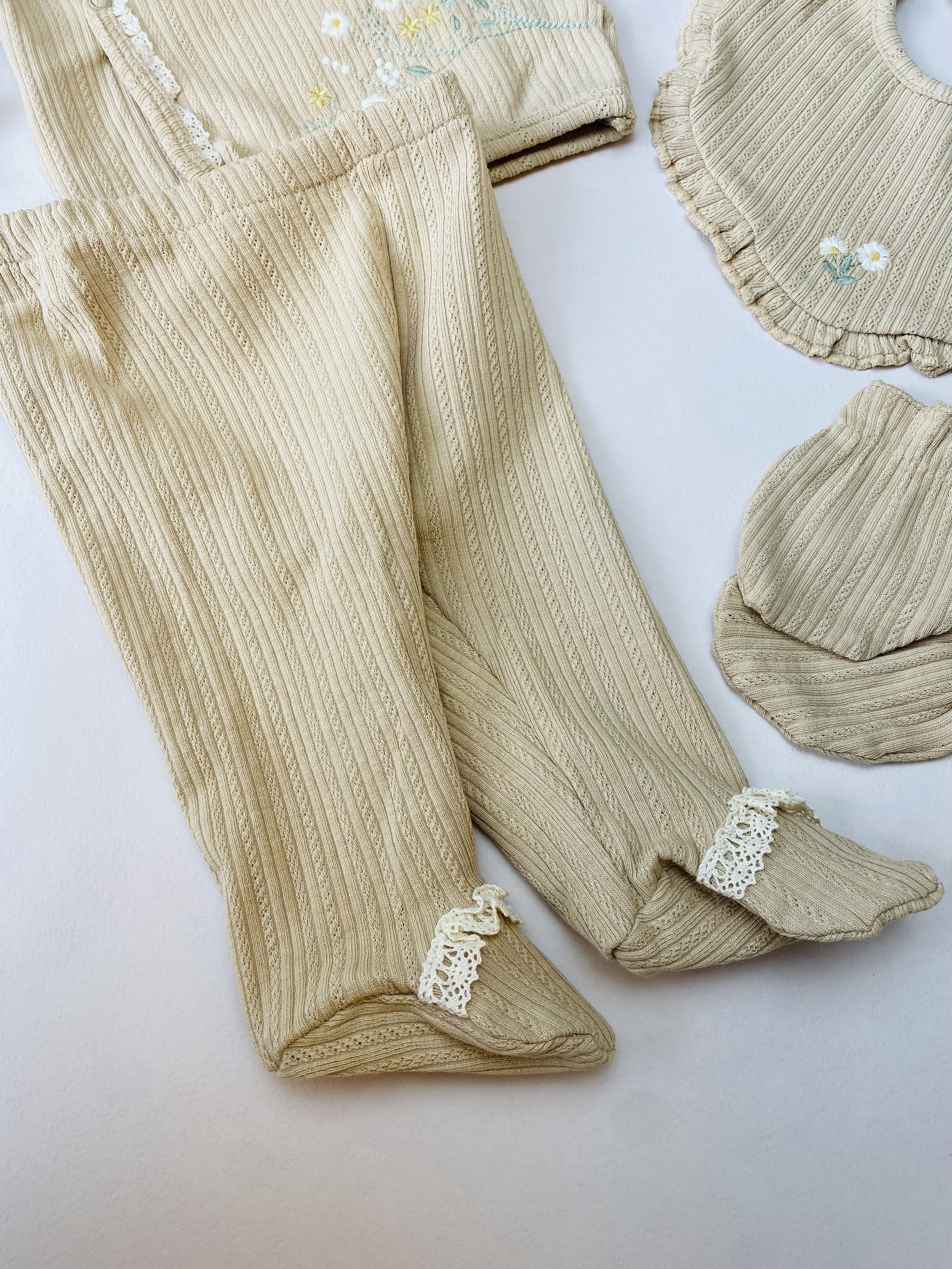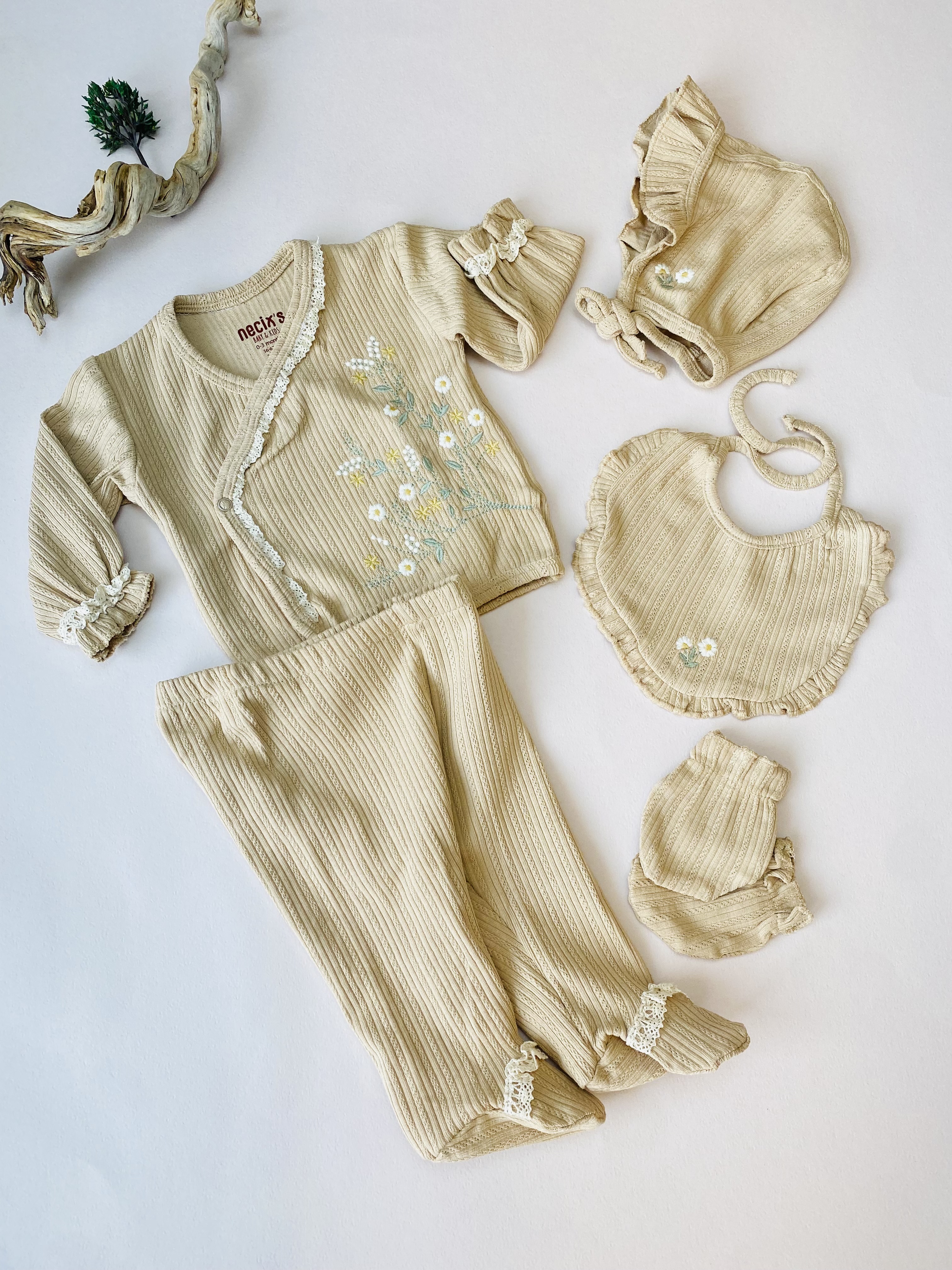 مامانایی که دنبال ست بیمارستانی خیلی خوشگل و خاص میگردین من زیباترین ستو براتون موجود کردم 🥰شما فقط عکسارو ورق بزنید و دیتیل کارو ببینید تمام گلدوزی شده و دانتل کار شده 👌جنس پارچه سوزن دوزی و ضدحساسیت و به شدت با کیفیت و پنج تکه شامل دستکش پیشبند کلاه و بلوز و شلوار میباشد😍
