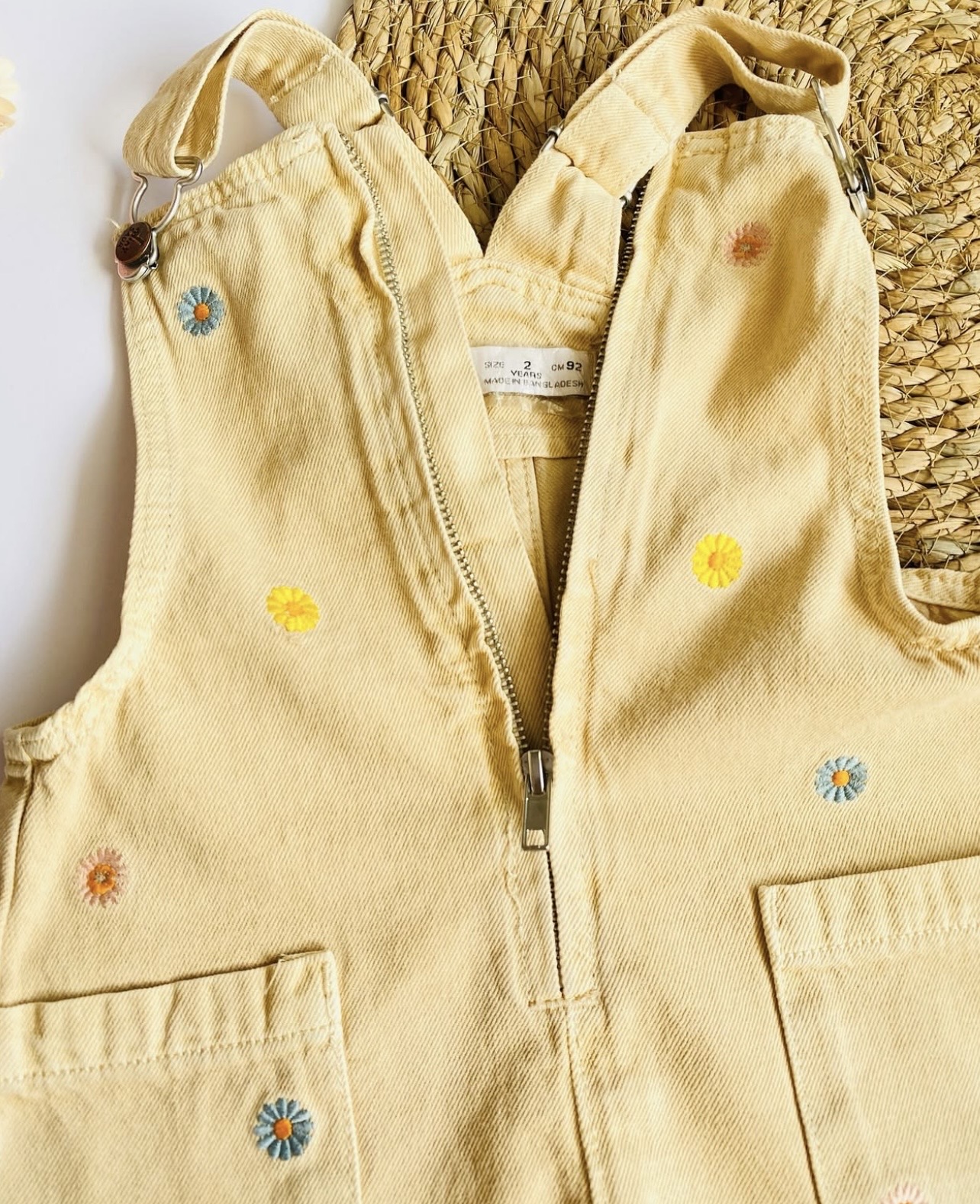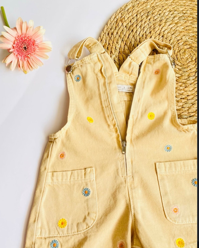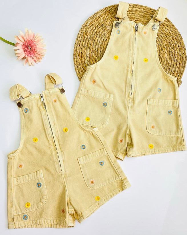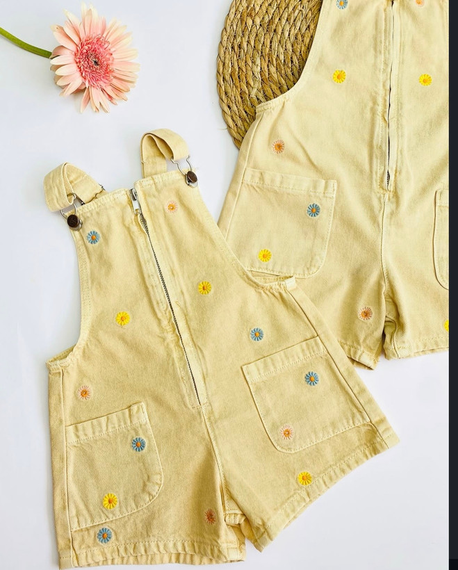 بیلر شلوارکی کتان رنگشکرم روشن فوق العاده خاص و زیبا😍گلایی که روش گلدوزی شده خیلی دلبر و نازه از نزدیک🥰من خودم عاشق این بیلرم❤️قسمت پیشبندش امکان افزایش قد ۳ الی ۴ سانتی رو داره👌